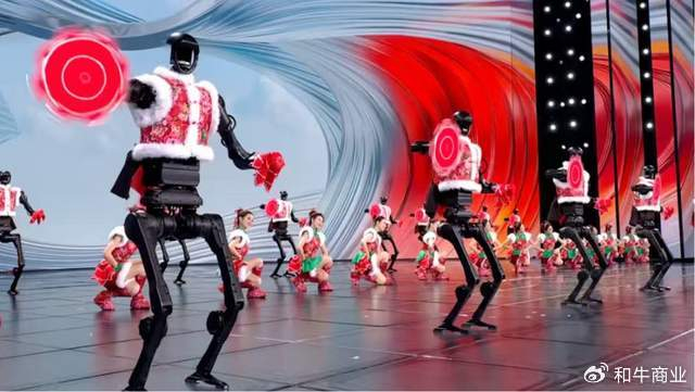 宇树机器人在2025年春节联欢晚会舞台上扭秧歌