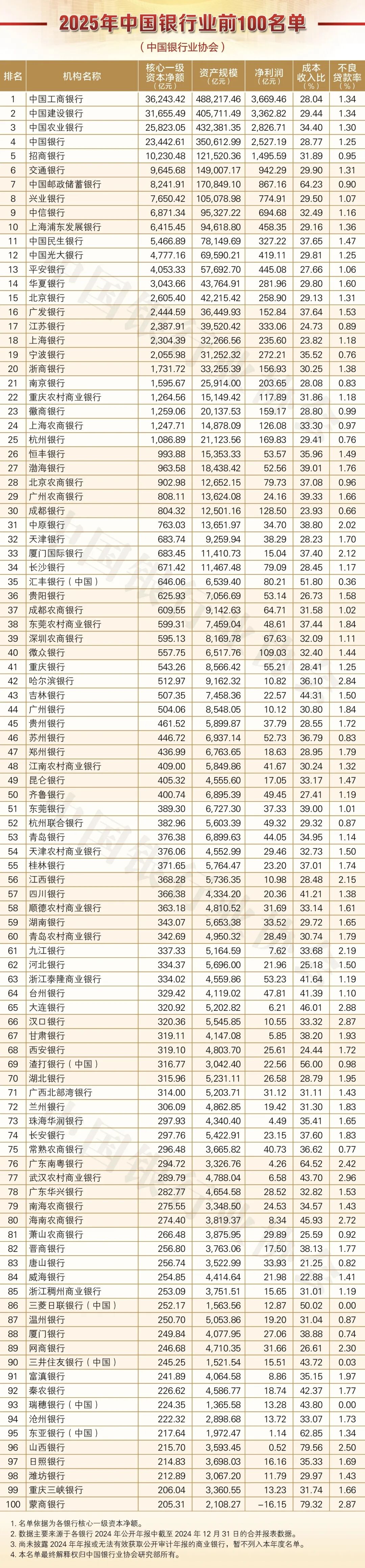 基于监管部门对商业银行资本计量的相关要求,该名单按照核心一级资本净额对商业银行进行排序,并对各家银行的经营规模、盈利能力、运营效率及资产质量进行综合展示。