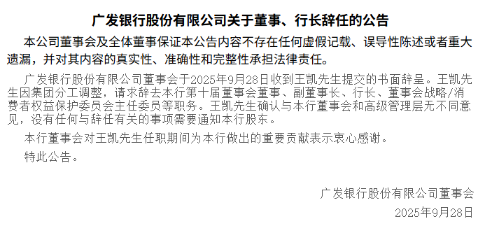 就在公众号“广发银行微讯社”发布人事变更信息的同一天,广发银行官网也发布了行长辞任的公告,公司于9月28日收到王凯的书面辞呈,辞去董事、副董事长、行长、董事会战略/消费者权益保护委员会主任委员等职务,并对其在任期间做出的贡献表示感谢。