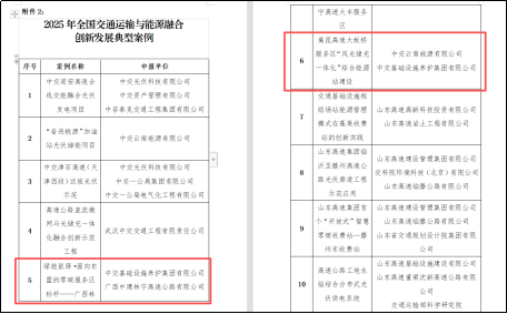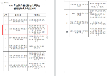 近日,由公司参与策划及设计的《承平高速雾灵山零碳服务区项目》《绿能邕驿面向东盟的零碳服务区标杆——广西林宁高速大丰服务区》及《嵩昆高速大板桥服务区“风光储充一体化”综合能源站建设》共三个项目,成功入选中国交通运输协会发布的“2025年全国交通运输与能源融合创新发展典型案例”名单,其中承平高速雾灵山零碳服务区被评为优秀案例,这标志着公司在交能融合领域的技术实力与创新成果获得权威认可。