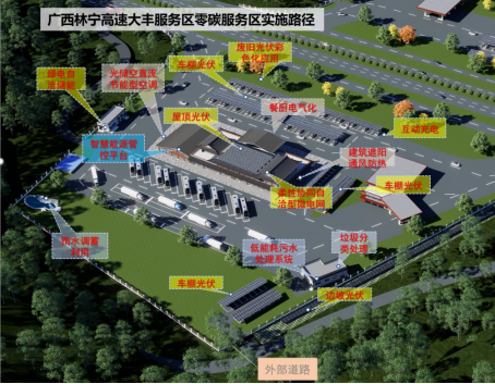 林宁高速大丰服务区主要通过涵盖分布式光伏发电、储能、直流负载和交直流配电网的高速公路服务区“光-储-直-柔”一体化系统,开展服务区低碳污水处理与节水回用等技术,实现零碳服务区建设。项目突出全生命周期加强降碳理念,多项创新技术赋能,深度融合广西地域特色、面向东盟,对各地开发符合自身特色的零碳服务区具有重要示范意义。