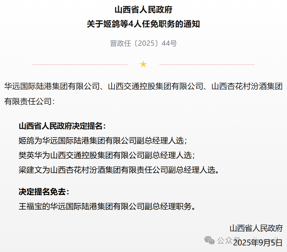 决定免去的王福宝已出任山西省交通运输厅党组成员、副厅长。其此前长时间在省属国企任职,曾任原省属重点国企山西能源交通投资公司董秘处处长,华远陆港集团董秘处处长、总经理助理等职,后于2021年末任集团副总经理,期间还兼任晋商信用增进公司副董事长。