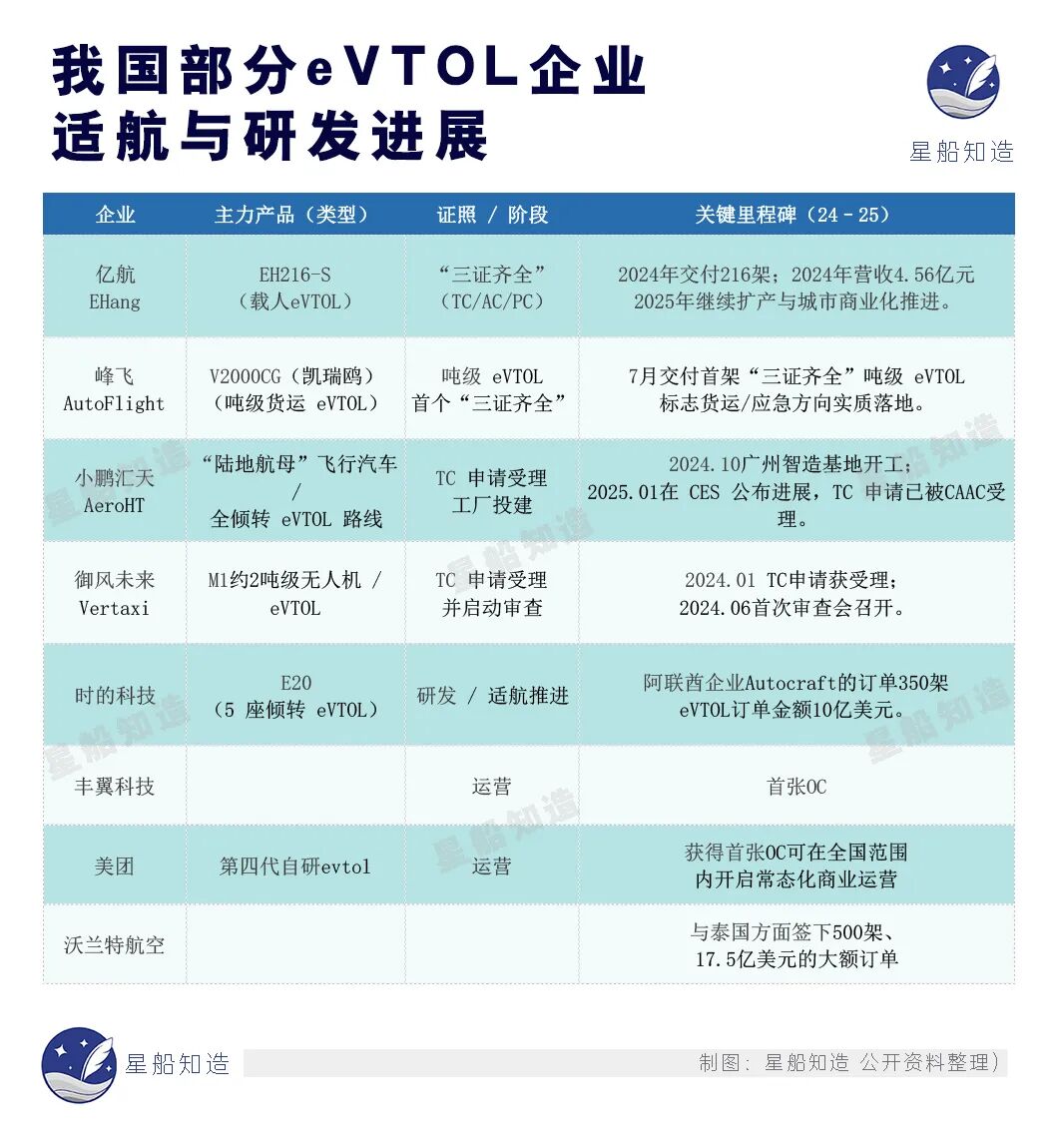 深圳的亿航EH216-S 拿下全球首个载人 eVTOL“三证齐全”;上海的峰飞V2000CG交付我国首架吨级以上“三证齐全”eVTOL等等。