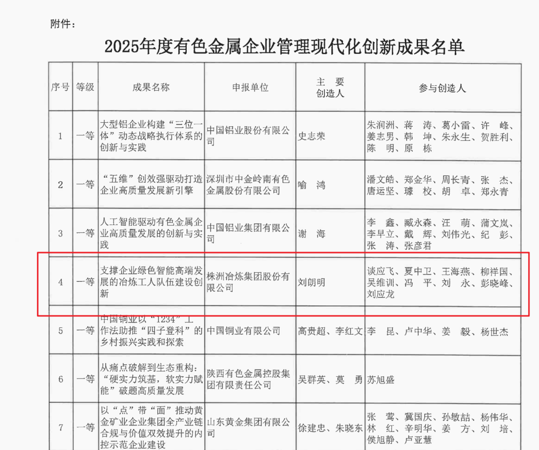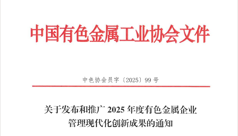 近日,公司申报的产改成果《支撑企业绿色智能高端发展的冶炼工人队伍建设创新》获评有色金属企业管理现代化创新成果一等奖,标志着公司在产业工人队伍建设改革领域的探索获得行业最高认可。
