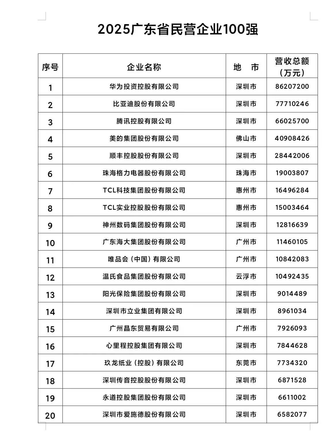 2025广东省民企百强排名前20上榜企业