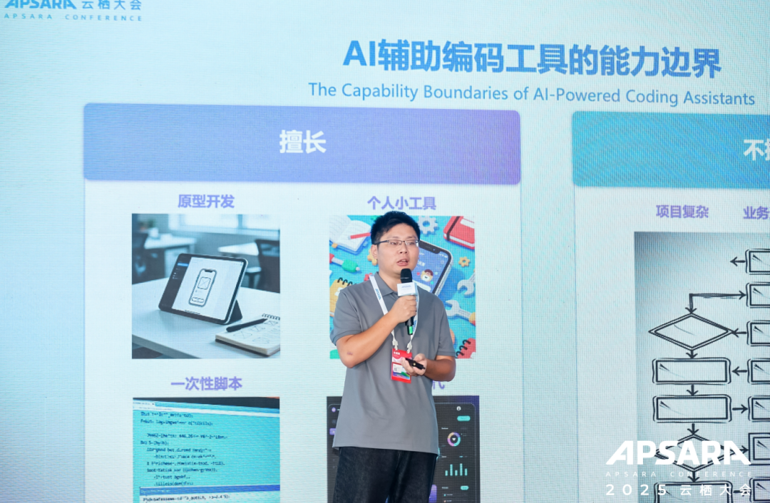 在应用案例上,朗新易视腾 AI 研发赋能负责人陈琛重点分享了两方面的想法。其一是将通义灵码与自身设计工具结合,实现了业务分析与产品设计的融合,形成“设计即开发”的模式,简单页面和接口开发效率提升约 50%,复杂场景提升约 20%。其二是将通义灵码应用于 AI CodeReview 环节,通过自动生成的审核信息配合人工复核,有效提升代码质量与审核效率。