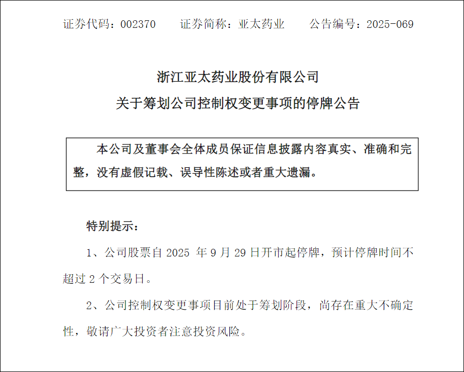 9月28日晚间,总部位于绍兴柯桥的上市公司亚太药业(002370.SZ)发布公告,宣布因控股股东及实际控制人正在筹划控制权变更事项,公司股票自9月29日起停牌,预计停牌时间不超过2个交易日。