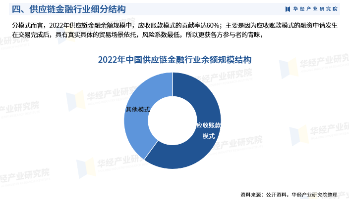 分模式而言,2022年供应链金融余额规模中,应收账款模式的贡献率达60%;主要是因为应收账款模式的融资申请发生在交易完成后,具有真实具体的贸易场景依托,风险系数最低,所以更获各方参与者的青睐,