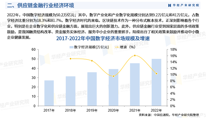 近年来,供应链金融行业受到国家层面的多项政策鼓励,是我国融资结构改革、资金服务实体经济、服务中小企业的重要抓手,从中央到地方陆续出台了相关政策来鼓励并推动中小微企业健康发展。2022年,中国数字经济规模为50.2万亿元;其中,数字产业化和产业数字化规模分别达到9.2万亿元和41万亿元,占数字经济比重分别为18.3%和81.7%。数字经济时代的来临,区块链技术作为一种分布式账本技术,正深刻影响着各个行业,特别是在企业数字化和供应链金融方面,展现出巨大的创新潜力。