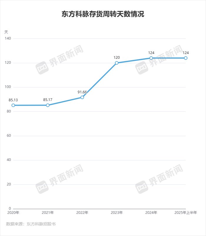 界面新闻从东方科脉港股招股书获悉,2022年至2024年及2025年上半年,公司的存货账面值分别为2.49亿元、2.32亿元、3.21亿元及4.8亿元,平均存货周转天数分别为97天、120天、124天及124天。但公司此前披露的A股招股书显示,2020年至2022年其存货周转天数分别为85.13天、85.17天和91.66天。