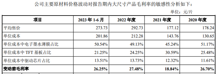 界面新闻从东方科脉2023年11月发布的回复上交所主板上市首轮问询函获悉,该公司主要电子纸显示模组产品的单位成本中,对应小、中、大三类不同型号产品,电子墨水薄膜的成本占比分别约30%、40%、50%。