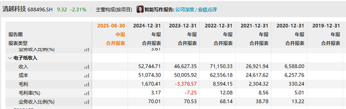 科创板上市公司清越科技于2020年下半年实现电子纸模组量产,到2023年该业务收入占比已超七成。多年来,清越科技也在“以价换量”,公司电子纸模组业务的毛利率于2020年至2022年从5.01%、8.56%升至12.08%,但随后持续走低,到2024年仅3.17%。