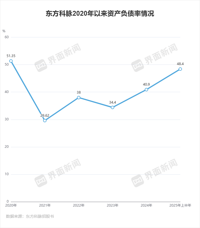 2022年至2024年及2025年上半年,东方科脉的资产负债率从38%、34.4%攀升至40.9%、48.4%。截至2025年6月30日,公司期末现金及现金等价物为8390万元,同期总负债增至7.63亿元,包含流动负债6.45亿元。截至7月31日,东方科脉借款2.85亿元,未动用银行信贷金额4.78亿元。
