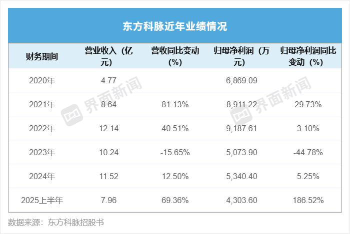 界面新闻结合东方科脉两次披露的招股书汇总,2020年至2024年及2025年上半年,该公司营业收入分别为4.77亿元、8.64亿元、12.14亿元、10.24亿元、11.52亿元及7.96亿元,归母净利润分别为6869.09万元、8911.22万元、9187.61万元、5073.9万元、5340.4万元及4303.6万元。