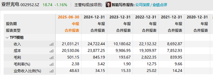 界面新闻查询获悉,今年上半年,亚世光电来自电子纸显示模组业务(即TFT模组)的收入占比48.63%,但该业务毛利率从2021年、2022年的9.66%、12.75%,下滑至2023年、2024年及2025年上半年的1.9%、3.42%、2.38%。