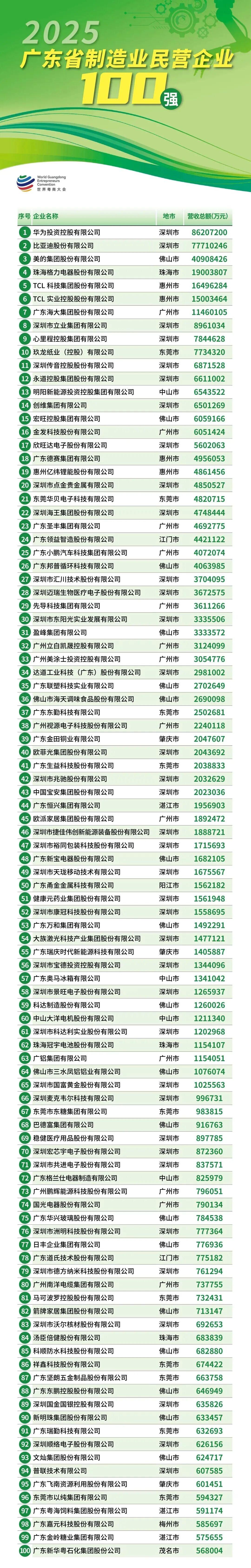 【大河财立方消息】9月29日,广东省工商联发布“2025广东省民营企业100强”榜单,华为、比亚迪、腾讯位列前三。