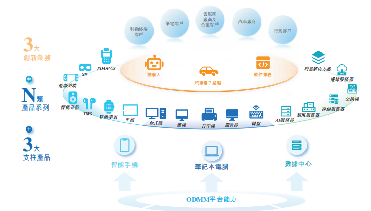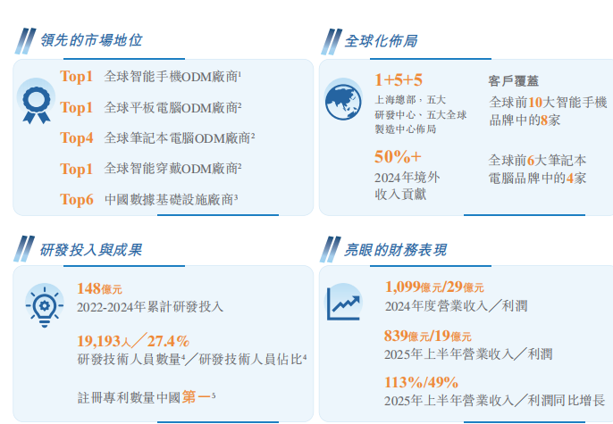 的智能手机ODM厂商;全球第一大的平板计算机ODM厂商和智能穿戴ODM厂商;全球第四、中国内地第一大的笔记本计算机ODM厂商。