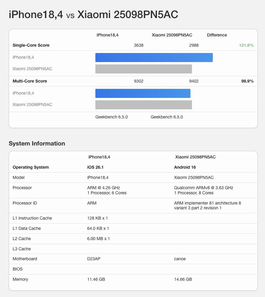 在 Geekbench 6.5.0 测试中,iPhone 17(iPhone18,4)在单核性能上以3638分领先小米 17(25098PN5AC)的2988分,而在多核性能上,小米 17以9402分略高于 iPhone 17的9302分。