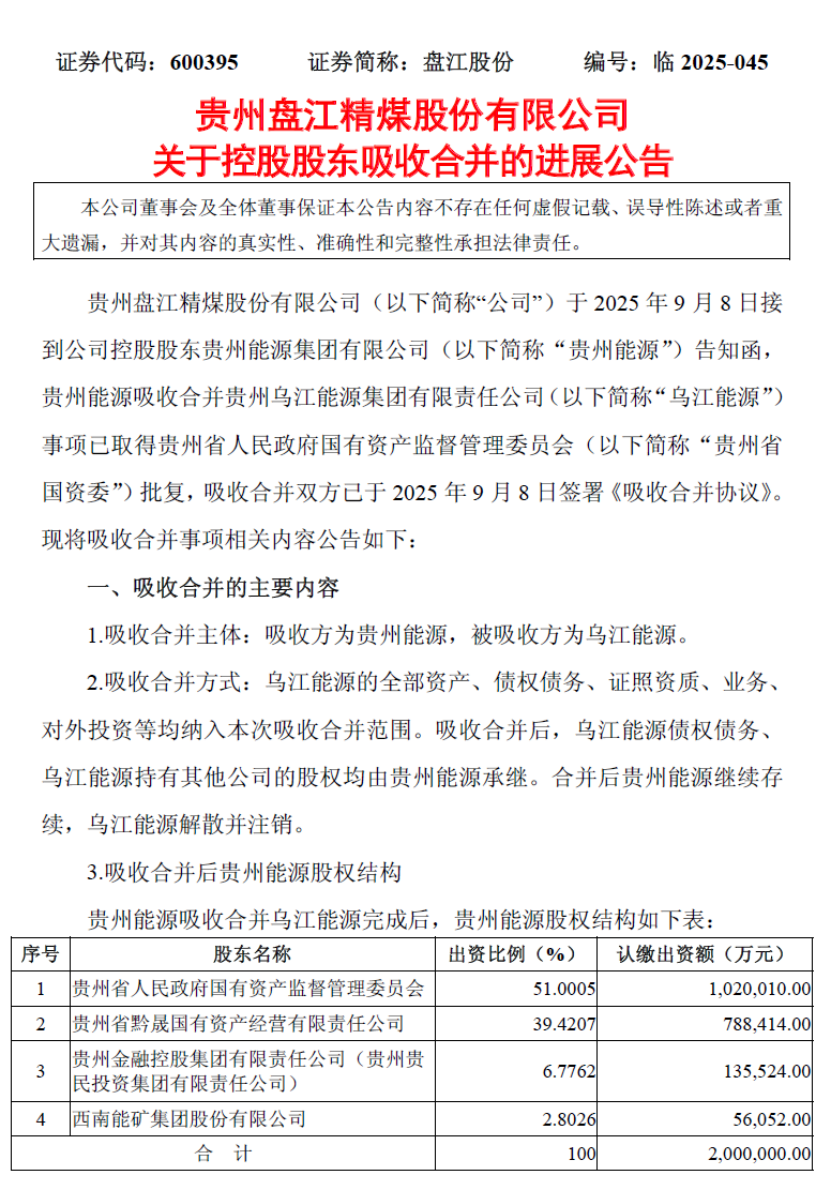 盘江股份公告称,9月8日接到公司控股股东贵州能源集团有限公司(以下简称“贵州能源集团”)告知函,贵州能源集团吸收合并贵州乌江能源集团有限责任公司(以下简称“乌江能源”)事项已取得贵州省人民政府国有资产监督管理委员会(以下简称“贵州省国资委”)批复。双方已于当日签署《吸收合并协议》,标志着贵州省能源产业结构优化迈出关键一步。