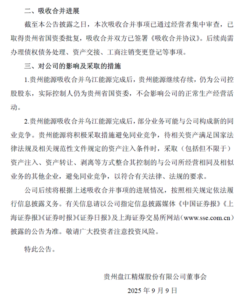 目前,此次吸收合并已通过经营者集中审查和贵州省国资委批复,后续将重点推进债权债务处理、资产移交及工商登记等程序。盘江股份也表示,将根据进展及时履行信息披露义务,投资者应关注相关公告,注意投资风险。