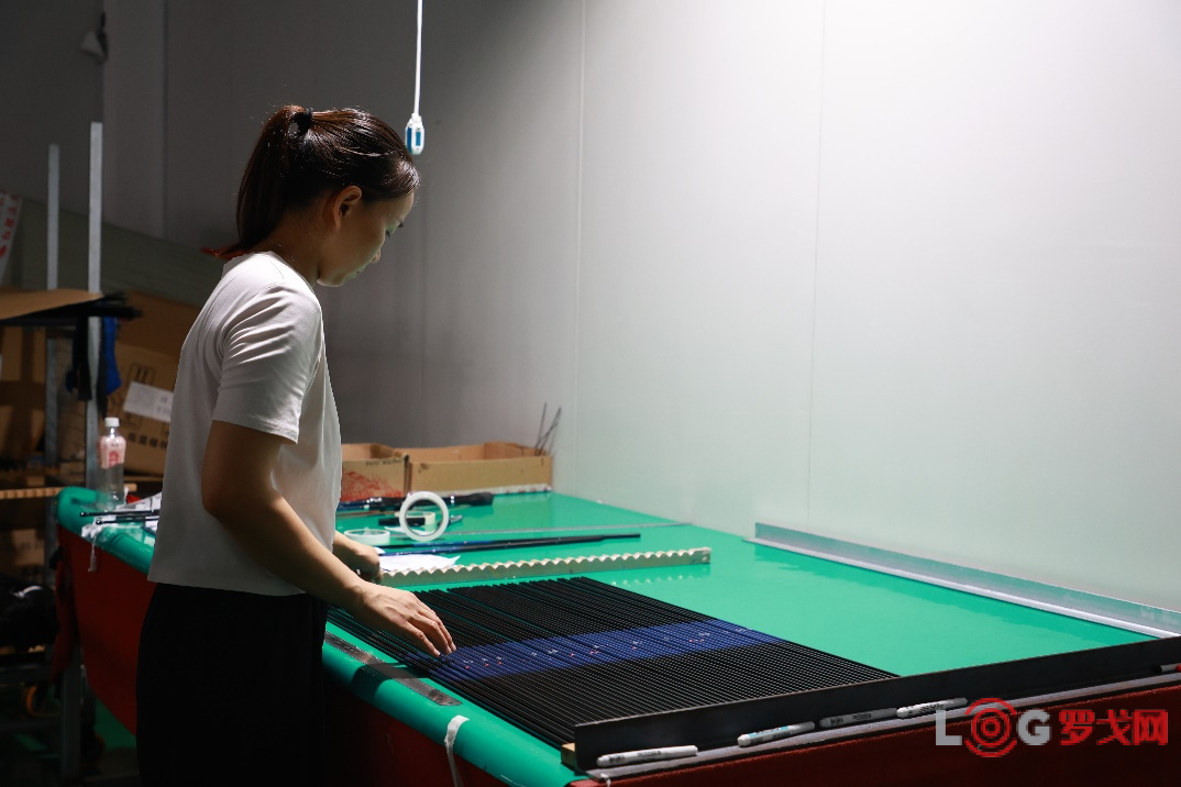 ▲钓具生产的大部分环节仍为手工完成,工人正在对竿节进行质检。
