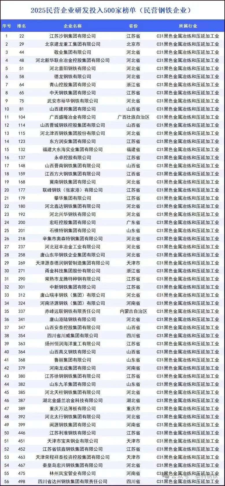 建龙集团位列《2025民营企业研发投入500家榜单》第29位