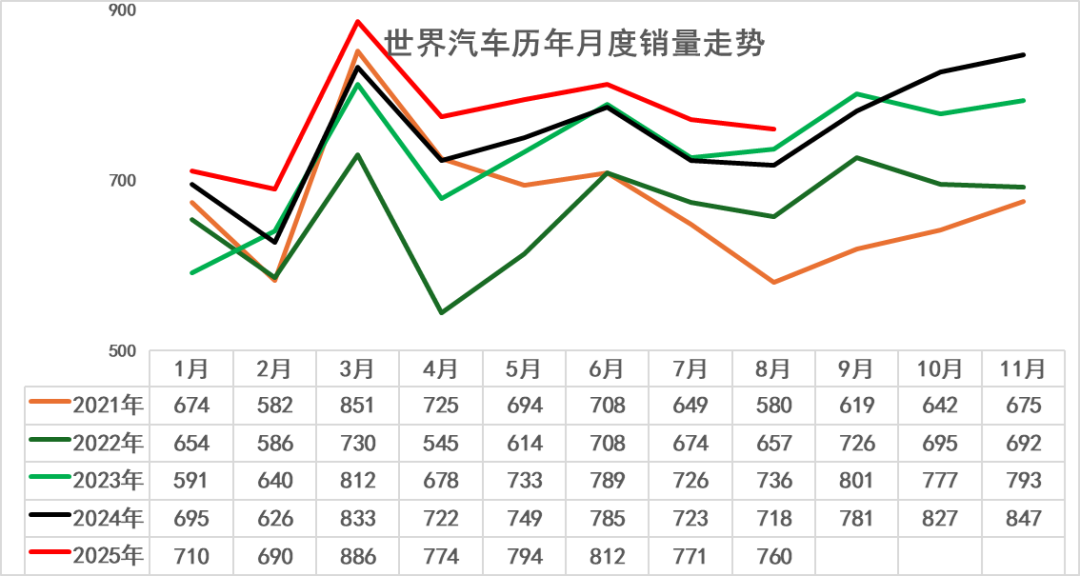 虽然世界汽车环境复杂,但2025年1-8月销量6198万台,超越2017年,恢复到高位水平,但仍低于2018年同期销量。