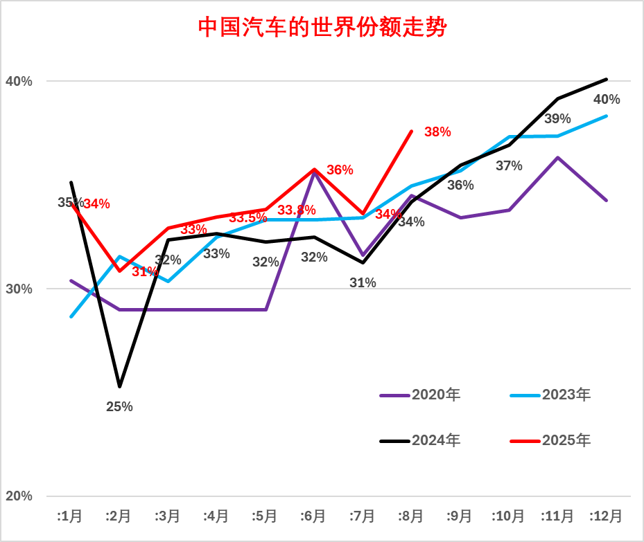 2025年8月中国占世界汽车份额38%