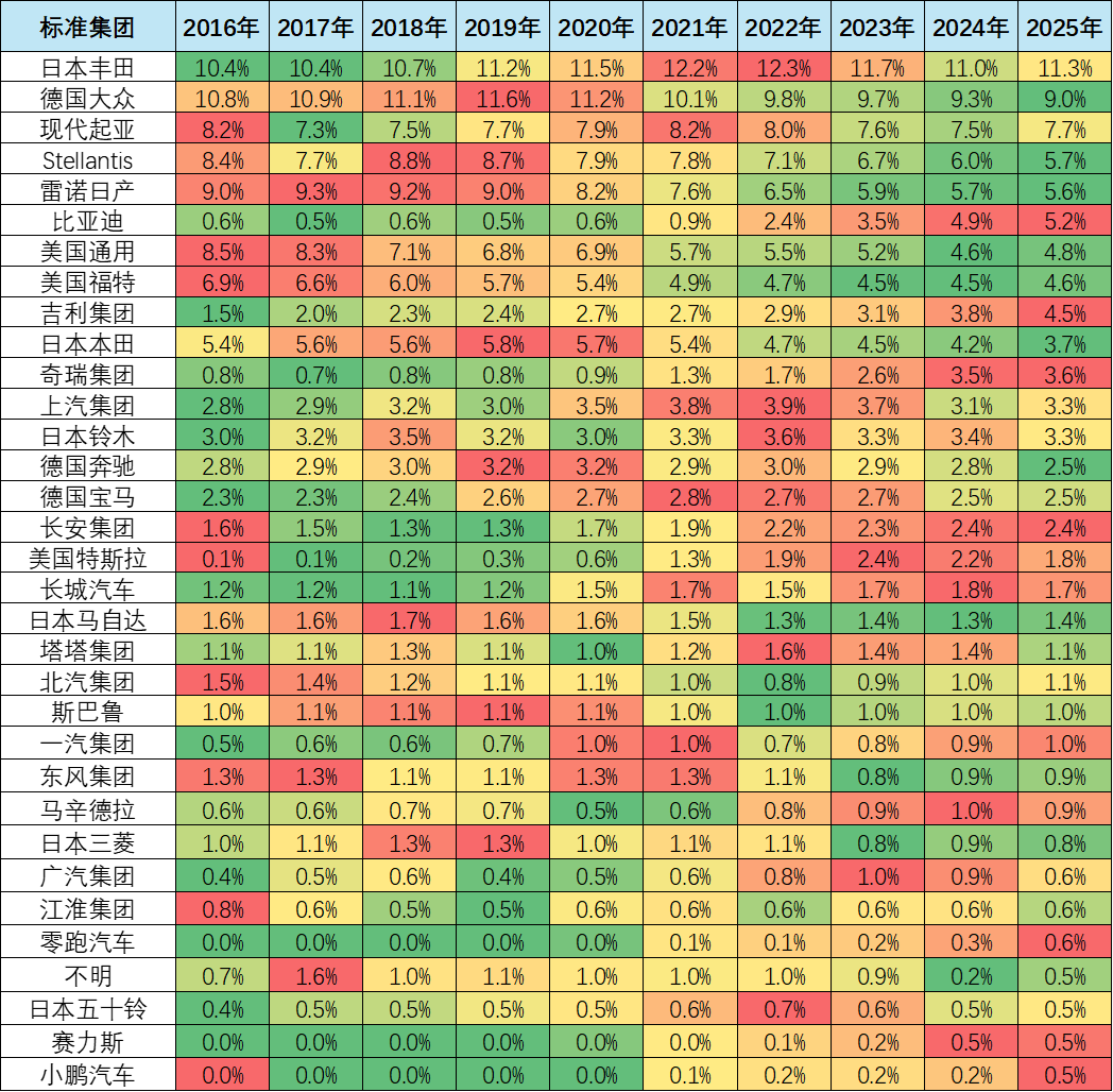 韩国现代汽车的走势较平稳,2025年1-8月达到7.7%,较2019年微增0.1%,韩国现代集团在北美和亚洲其它市场表现很好,但在中国因产品力不强而持续走势偏弱。