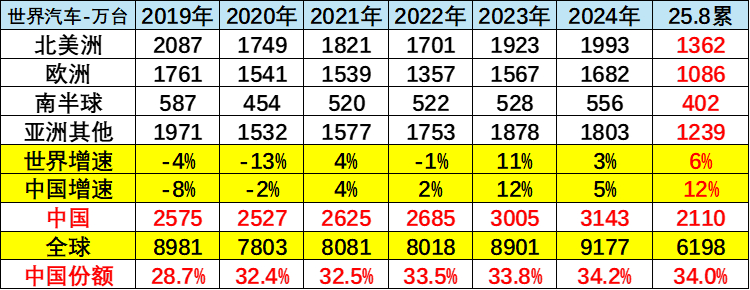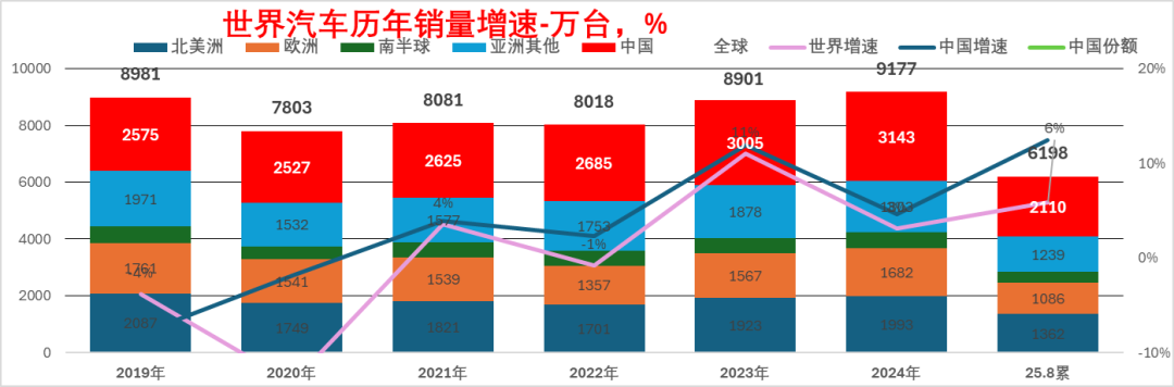 2020年以来中国的世界份额持续提升,到2023年达到33.8%,2024年中国车市达到34.2%,2025年1-8月份中国车市达到世界34%,已经是很好的。