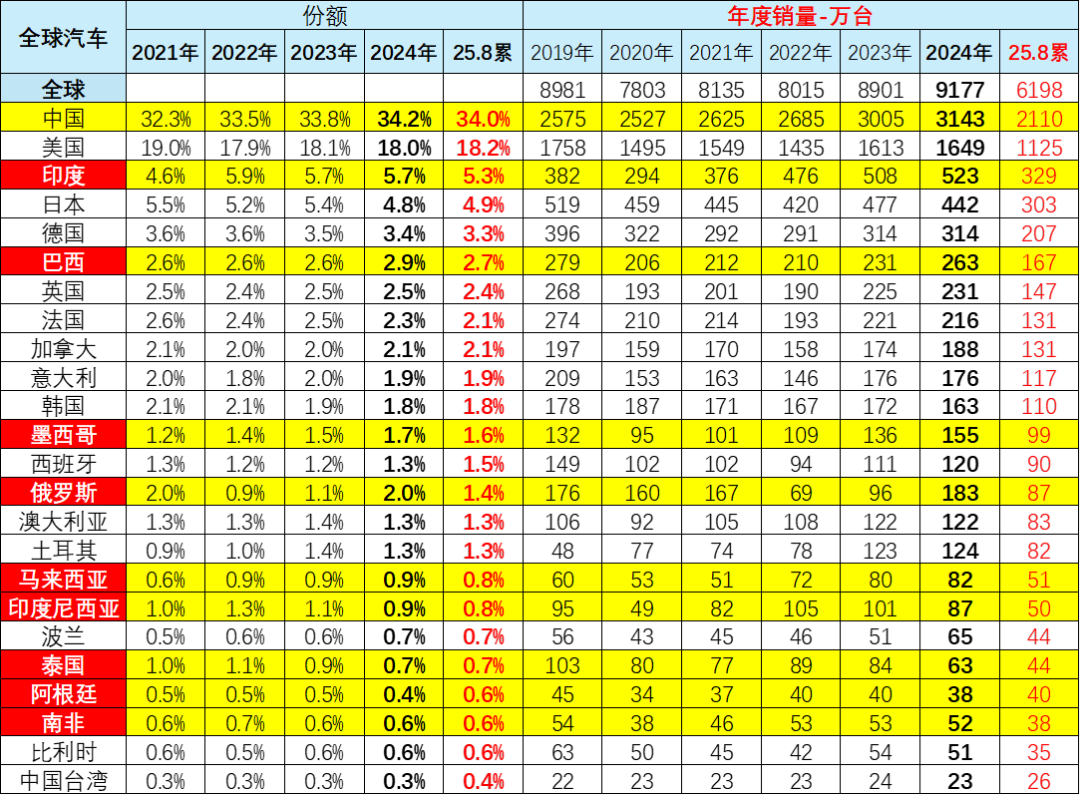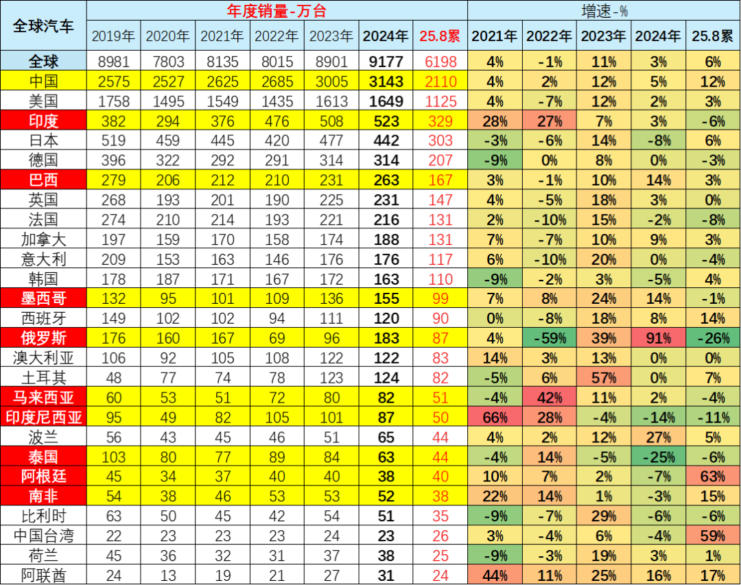 2025年1-8月的全球汽车销量增长6%,其中中国汽车销量2110万台、增长12%,美国销量1125万台增3%,印度销量329万台降6%,日本销量303万台增6%,德国销量207万台降3%。目前看中国市场最有活力,增速快。俄罗斯市场下滑严重,墨西哥增速放缓,而南美的阿根廷等市场表现较好。