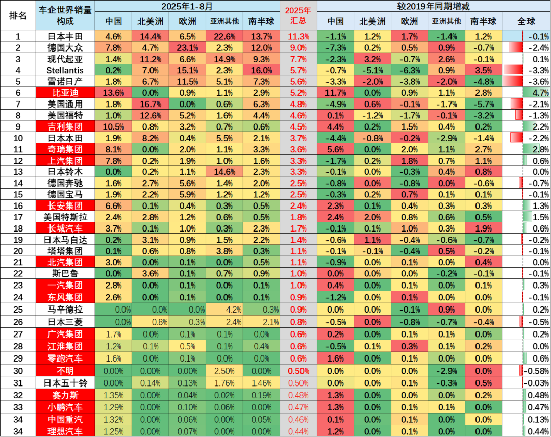2025年1-8月丰田集团表现相对较强,较2019年下降0.1个百分点,2025年在世界份额保持在11.3%左右的水平,这也是因为丰田在欧洲和北美市场总体表现较强。