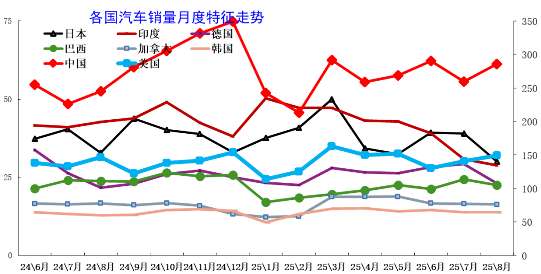 7、各国汽车销量月度走势特征