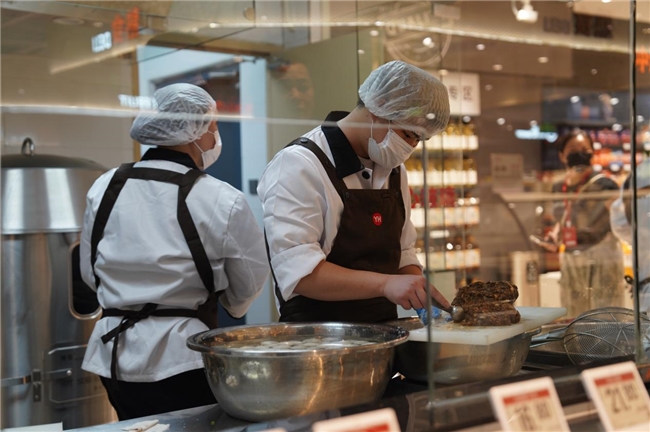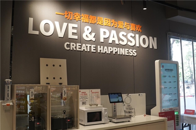 烘焙与熟食区域也迎来了显著扩容,经营模式改为自营,现场制作的SKU大幅增加。烘焙区全面升级,以现烤商品为主,植入网红产品如榴莲千层、金秋桂花丰收欧包、现烤月饼等。熟食区引入九多肉多、双汇东来同款熟食,新增牛肉卷、北京烤鸭、现炒板栗、烤鸡、三文鱼寿司、汉堡、披萨、凉皮等新品,并通过明厨亮灶方式让食品安全可视化管理。