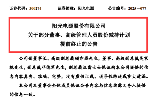 近日,阳光电源(300274)发布公告称,公司部分董事及高级管理人员股份减持计划提前终止。