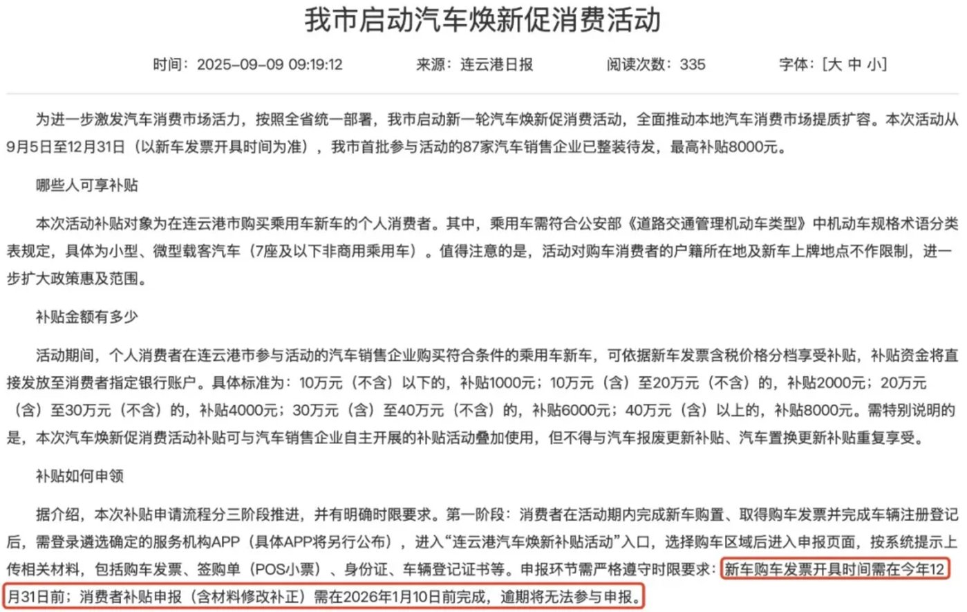 此外,地方补贴的“先到先得”规则,也给消费者增加了额外的风险。例如连云港的政策,不仅要求购车发票须在12月31日前开具,还规定补贴申报要在明年1月10日前完成,一旦逾期就视为自动放弃。
