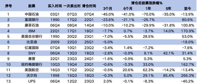 结果显示,在这24只股票中,若以巴菲特清仓当季最后一个交易日为基准,那么清仓一年内,有13只股票均出现了不同程度的下跌。其中,跌幅最大的三只为中石油(港股)、康菲石油和富国银行,一年跌幅分别为-70%、-30%和-25%。