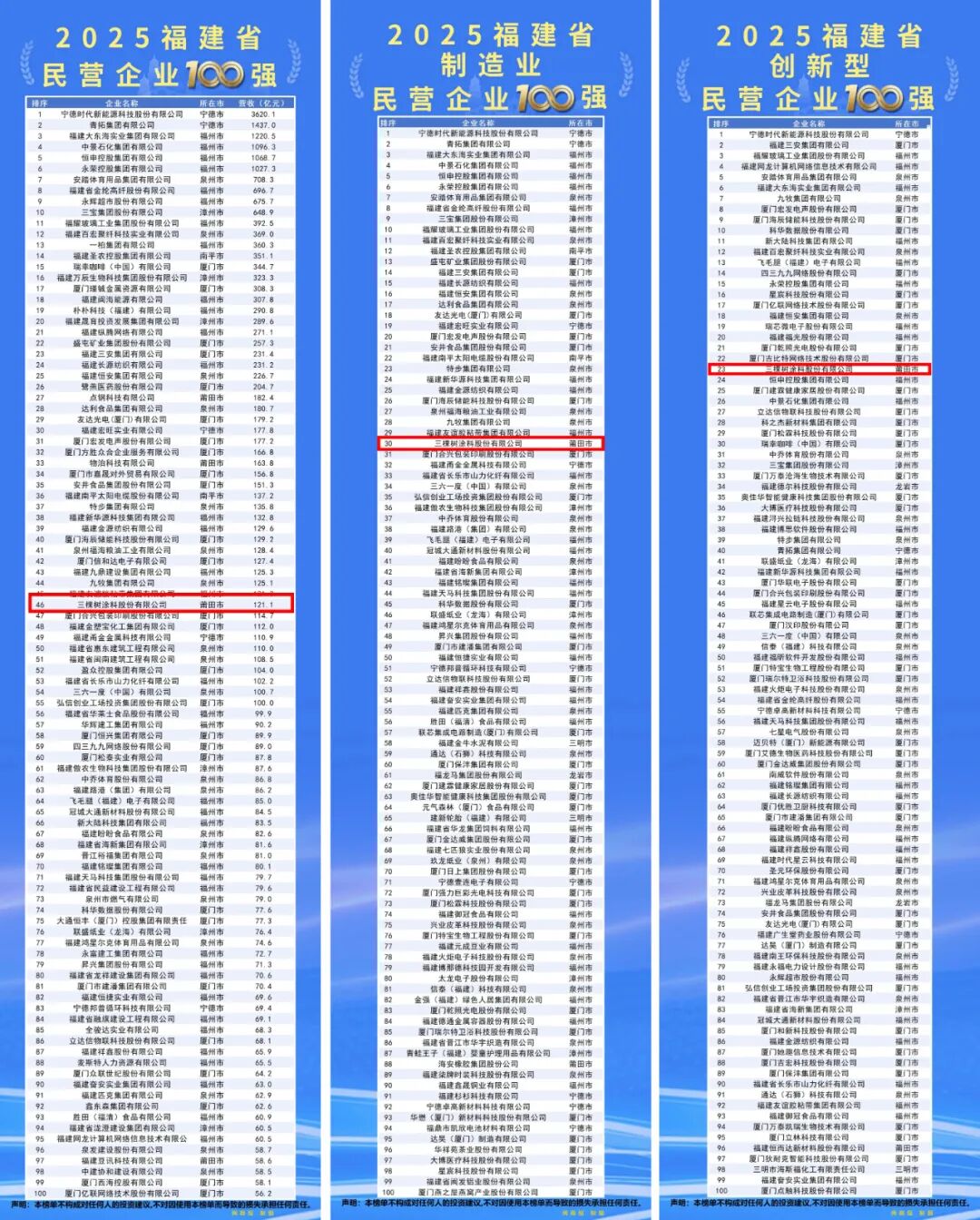 9月28日,由福建省工商业联合会、宁德市人民政府主办,宁德市工商业联合会(总商会)承办的2025福建民营企业100强发布暨宁德市产业招商推介会在福建省宁德市举行。会上发布2025福建省民营企业100强、制造业民营企业100强、服务业民营企业100强、创新型民营企业100强4个榜单以及调研分析报告。其中,三棵树涂料股份有限公司(以下简称三棵树)上榜2025福建省民营企业100强、制造业民营企业100强、创新型民营企业100强3个榜单。