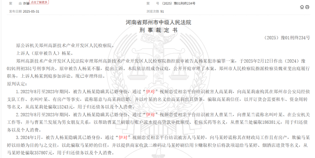 而另一份今年5月披露的诈骗案件显示,被告人杨某隐瞒其已婚身份,通过伊对视频恋爱相亲平台结识3名被害者,诈骗金额最高的多达35万元。