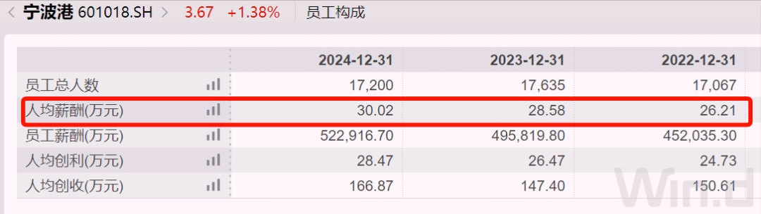 丰厚的利润也是职工能拿到较丰厚薪酬的基本保证。2024年,宁波港职工总数超过1.7万人,去年人均创利28.5万元,人均税前薪酬超过30万元,比2023年增加大约1.4万元。