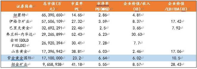 选取国际黄金巨头与港股黄金龙头相比,当前紫金黄金国际PE、市净率、企业价值/收入等均略低于行业中位数水平,但显著高于纽蒙特、巴里克黄金。