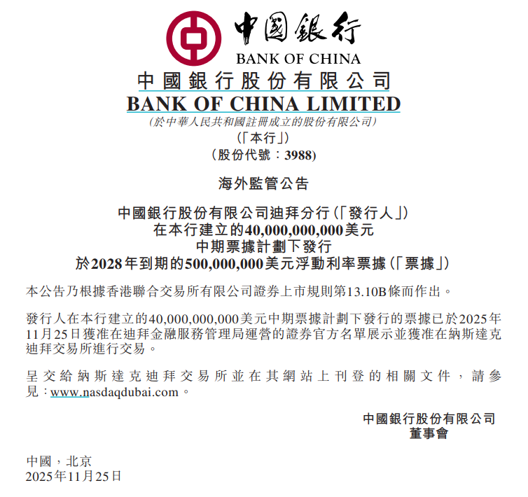 【大河财立方消息】11月25日,中国银行公告,在400亿美元中期票据计划下发行的票据,已获准在迪拜金融服务管理局运营的证券官方名单展示,并获准在纳斯达克迪拜交易所进行交易。