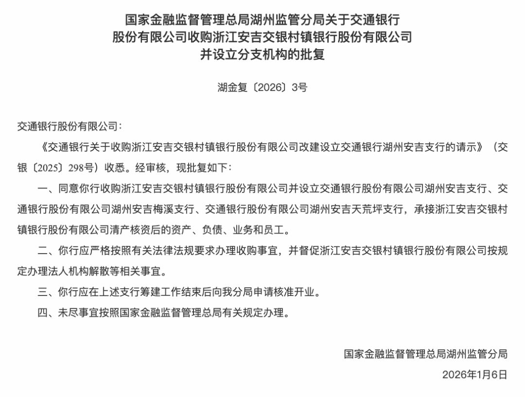 1月6日,交通银行获批收购浙江安吉交银村镇银行股份有限公司(下称“安吉交银村镇银行”)。