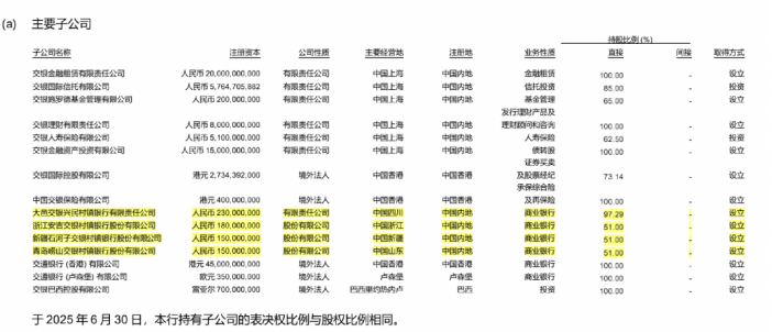 报告期内,该行还控股的村镇银行包括大邑交银兴民村镇银行、新疆石河子交银村镇银行和青岛崂山交银村镇银行,截至2025年6月末的持股比例分别为97.29%、51%、51%。