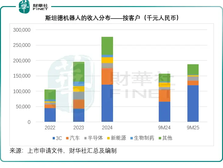 从上图可见,功能性机器人是该公司主要的收入来源,占了其2025年前三季总收入的68.42%,尤其专注于3C、汽车及半导体等行业,3C客户更是占了其收入的一半以上,见下图。