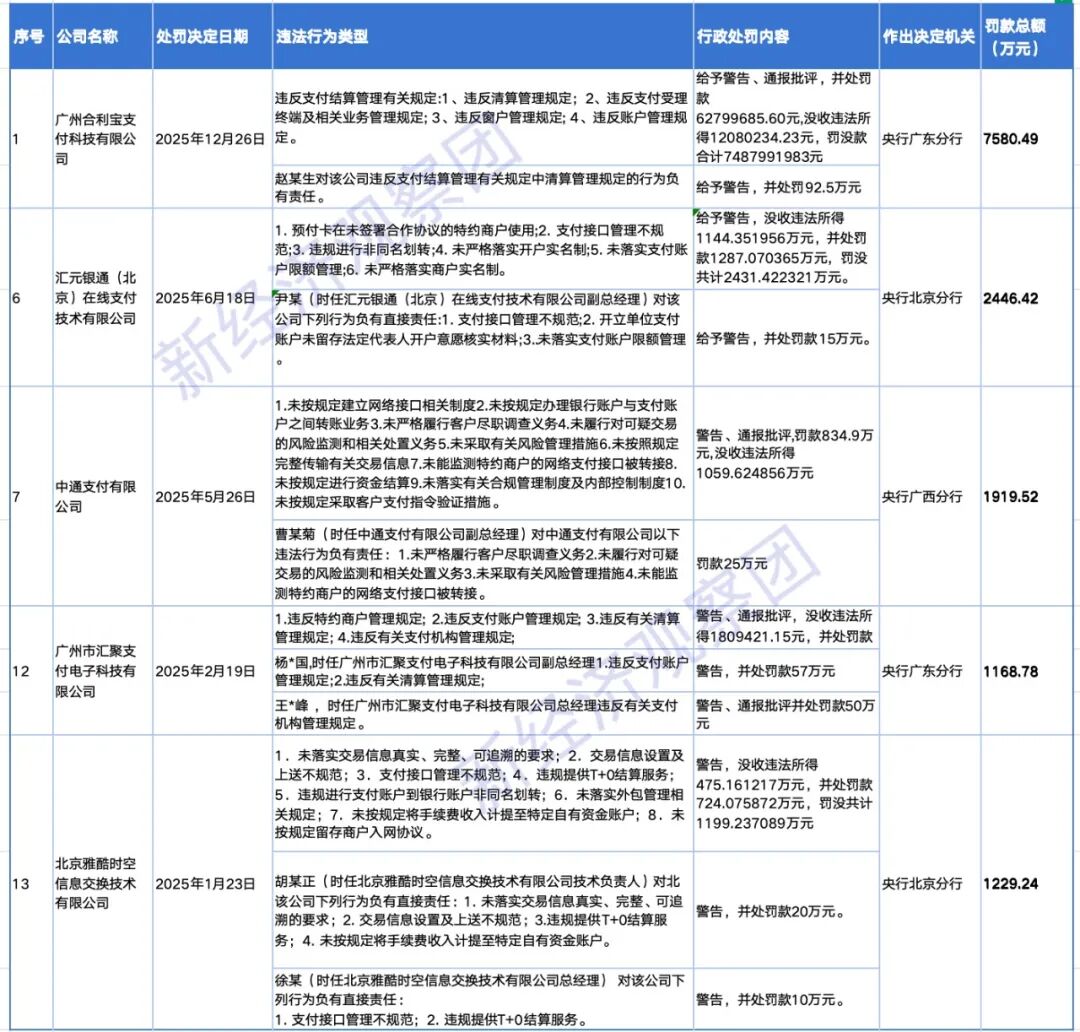 2025年13家支付机构被重罚2.12亿 合利宝以7500万登顶