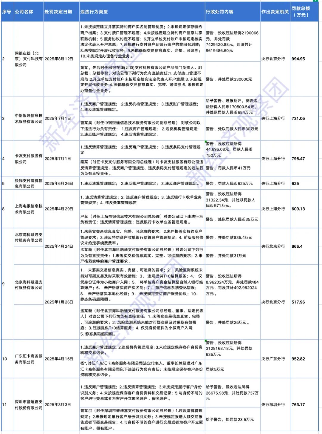 8家被罚500-1000万的支付机构(含责任人被罚金额)制表:新经济观察团