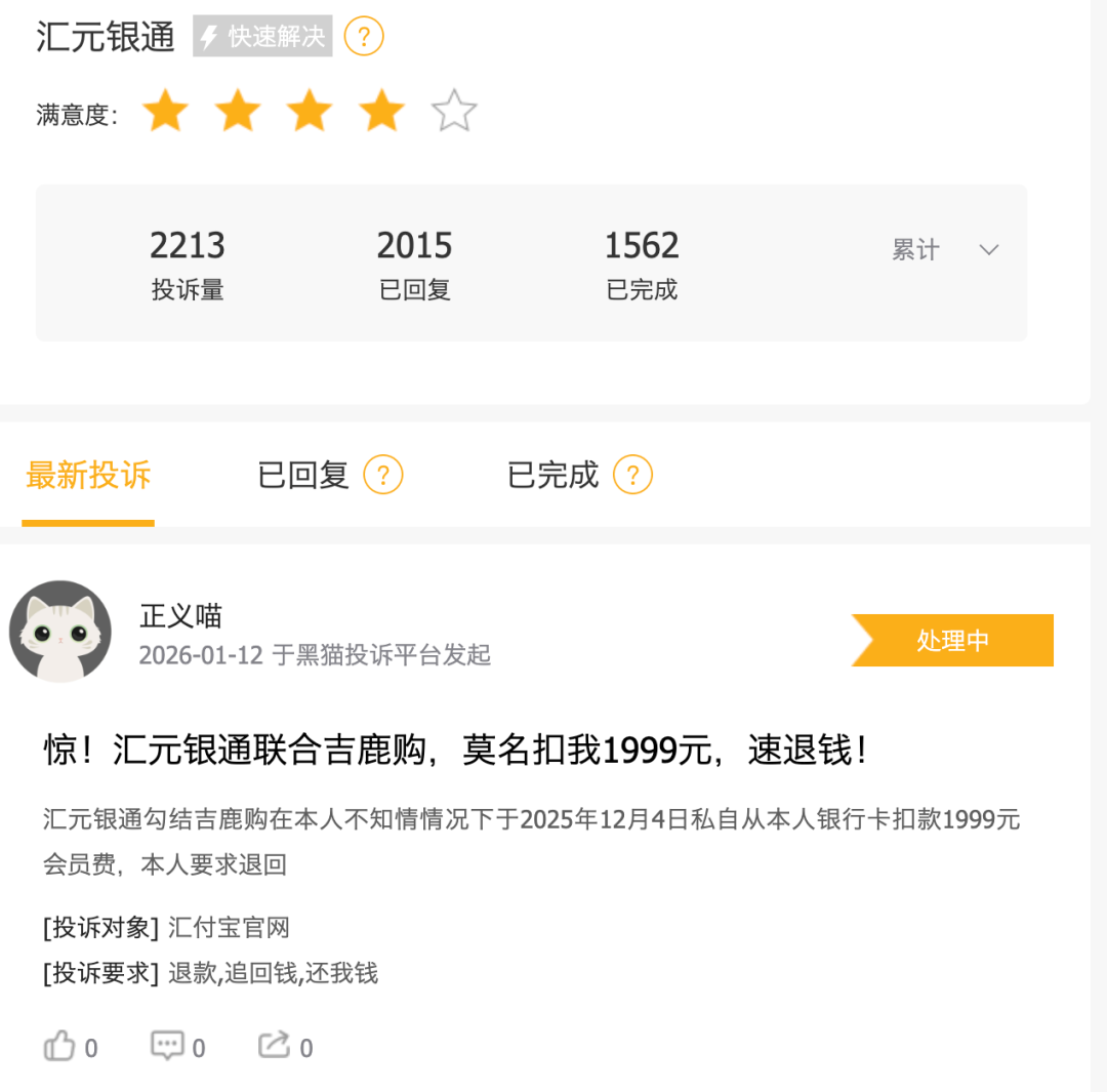 汇元银通也不例外。该机构在黑猫投诉的投诉量为2231条,大量涉及私自扣款、收取会员费、变相高利贷等问题,几乎成为非法贷款平台的“帮凶”。