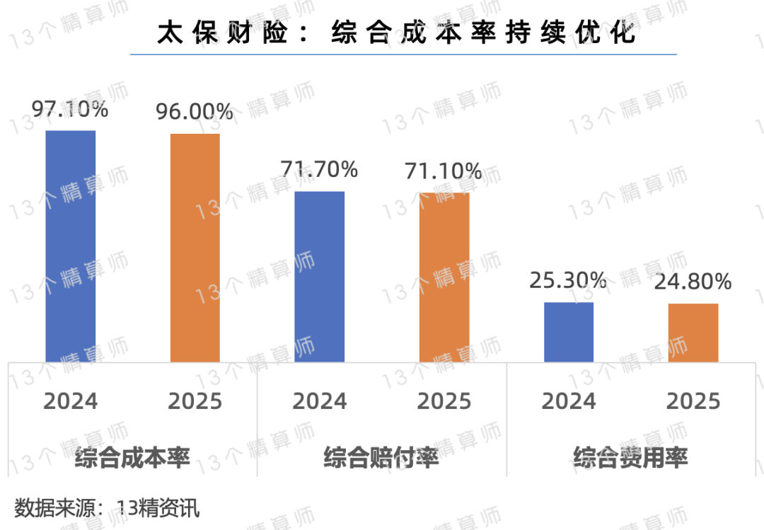 这背后得益于综合成本率的改善,综合成本率从97.1%降至96%,下降1.1个百分点,其中,赔付率下降0.6个百分点,费用率下降0.5个百分点。
