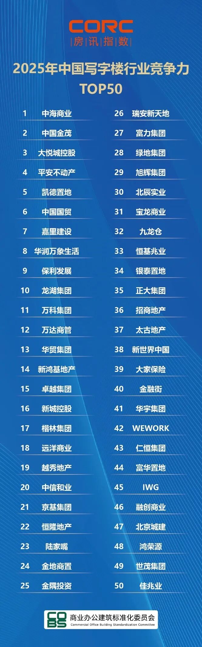“2025中国写字楼产业园行业竞争力100强”从整体上榜格局来看,写字楼TOP50榜单,央企以绝对优势包揽前三。中海商业蝉联第一,中国金茂与大悦城紧随其后,三者共同构成我国商业办公行业的最强矩阵。这三家企业不仅排名前三,同时也是今年竞争力表现增速最快的头部企业。中海商业长期深耕COOC中海商务领域,覆盖范围广且服务支持体系日渐成熟;中国金茂则凭借布局优势和专业服务巩固市场地位;而大悦城依靠优质商业业务与行业顶尖的品牌信誉度,继续维持其在消费者中的高度粘性。